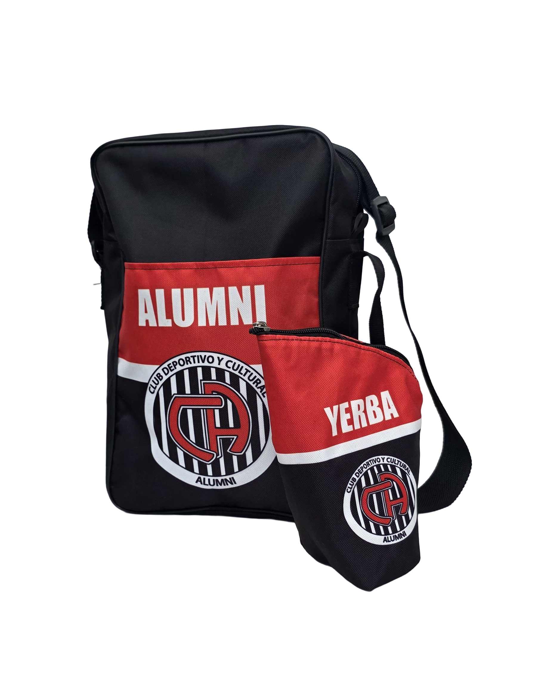 La mateada completa con los colores de Alumni. Este bolso matero incluye yerbero integrado con diseño sublimado exclusivo — todo lo que necesitás para compartir un mate con los colores de tu club.